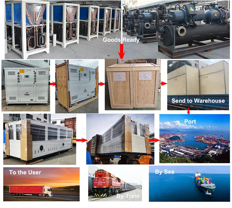 1. Verzending per vliegtuig: Omdat de koelmachine is uitgerust met een compressor, waterpomp en ventilatoren, zijn het gecomprimeerde koelmiddel en de olie in de compressor een gevaarlijk item met explosiegevaar, dus moet het gecomprimeerde koelmiddel vóór transport worden vrijgegeven. (Het betekent dat een waterkoeler zonder koelmiddel wordt gebruikt als u voor deze verzendmethode kiest. Nadat de machine op uw bestemming is aangekomen, moet u koelmiddel toevoegen door lokale professionals. De luchtvaartmaatschappij vraagt ons ook om veel documenten te verstrekken om te bewijzen dat de koelmachine geen gevaarlijk product is. De vrachtkosten per vliegtuig zijn erg hoog en kunnen hoger zijn dan de kosten van de koelmachine. Dus per vliegtuig voor levering is niet de transportmodus die aan onze klant wordt aanbevolen.